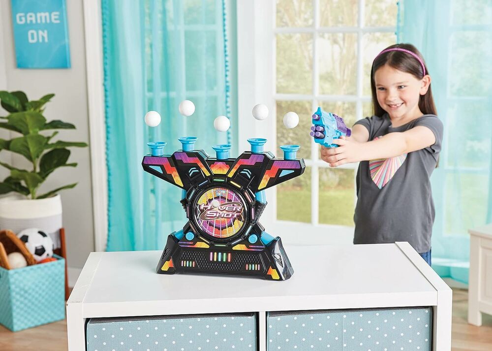 The Arcade Hover Shot is the ultimate target shooting challenge. Balls float on a stream of air while you try to take you best shot to shoot them with the foam dart blaster. Increase the difficulty by using the smaller balls or increasing the shooting distance. Place 5 balls ontop of the 5 pillars. Turn the air base on in order to start the fans and levitate the balls. Load the soft foam darts into the blaster and try to shoot down the balls. There are multiple ways to play and challenge your family & friends. 5 Shot Challenge - players take turns and see how many balls they can knock down with 5 shots. The player that knocks down the most wins. Race Against The Clock - Set a desired time and the player that knocks down the most during the time wins. Expert Mode - for a more challenging game use the smaller balls. You can also mix the two different size balls for a unique game.
