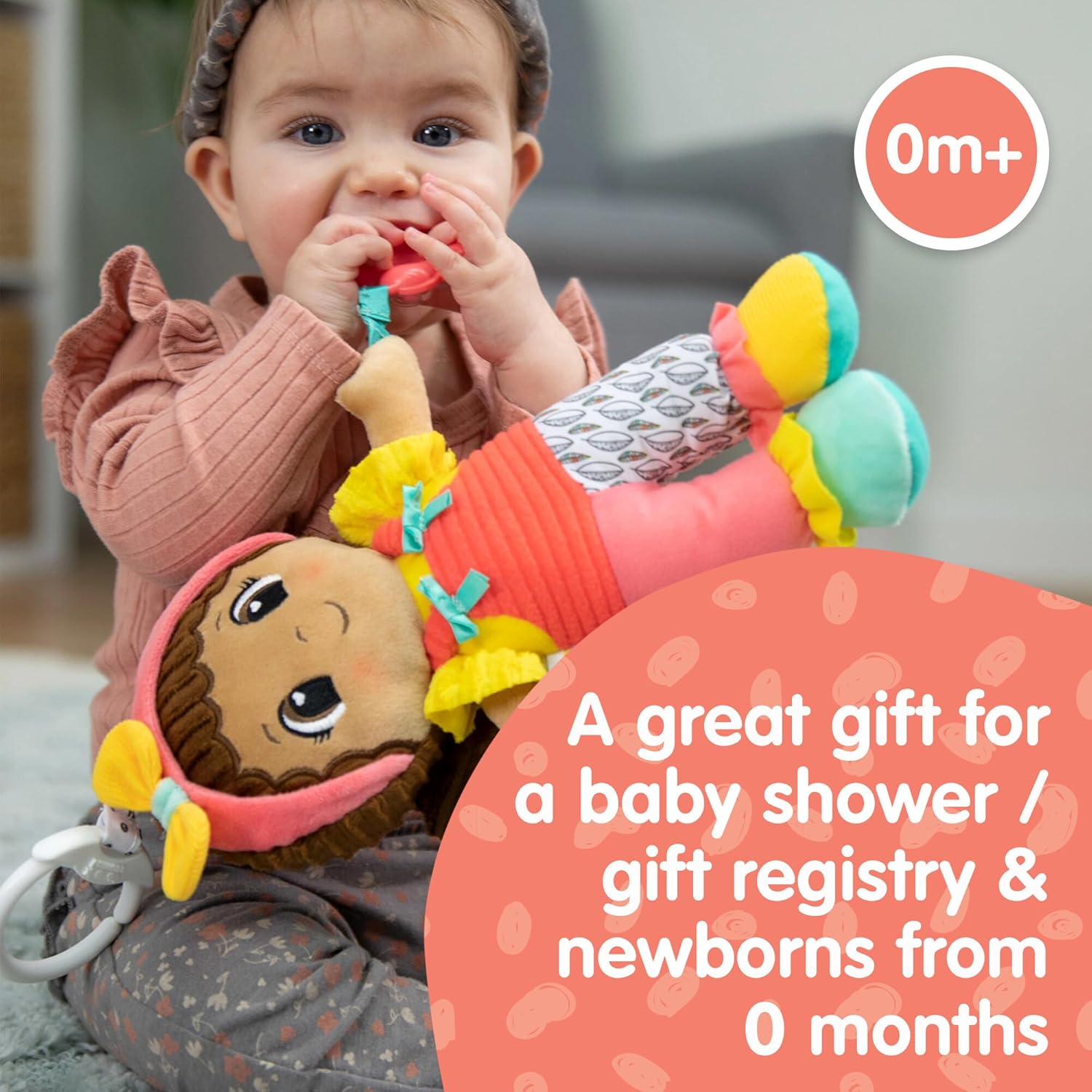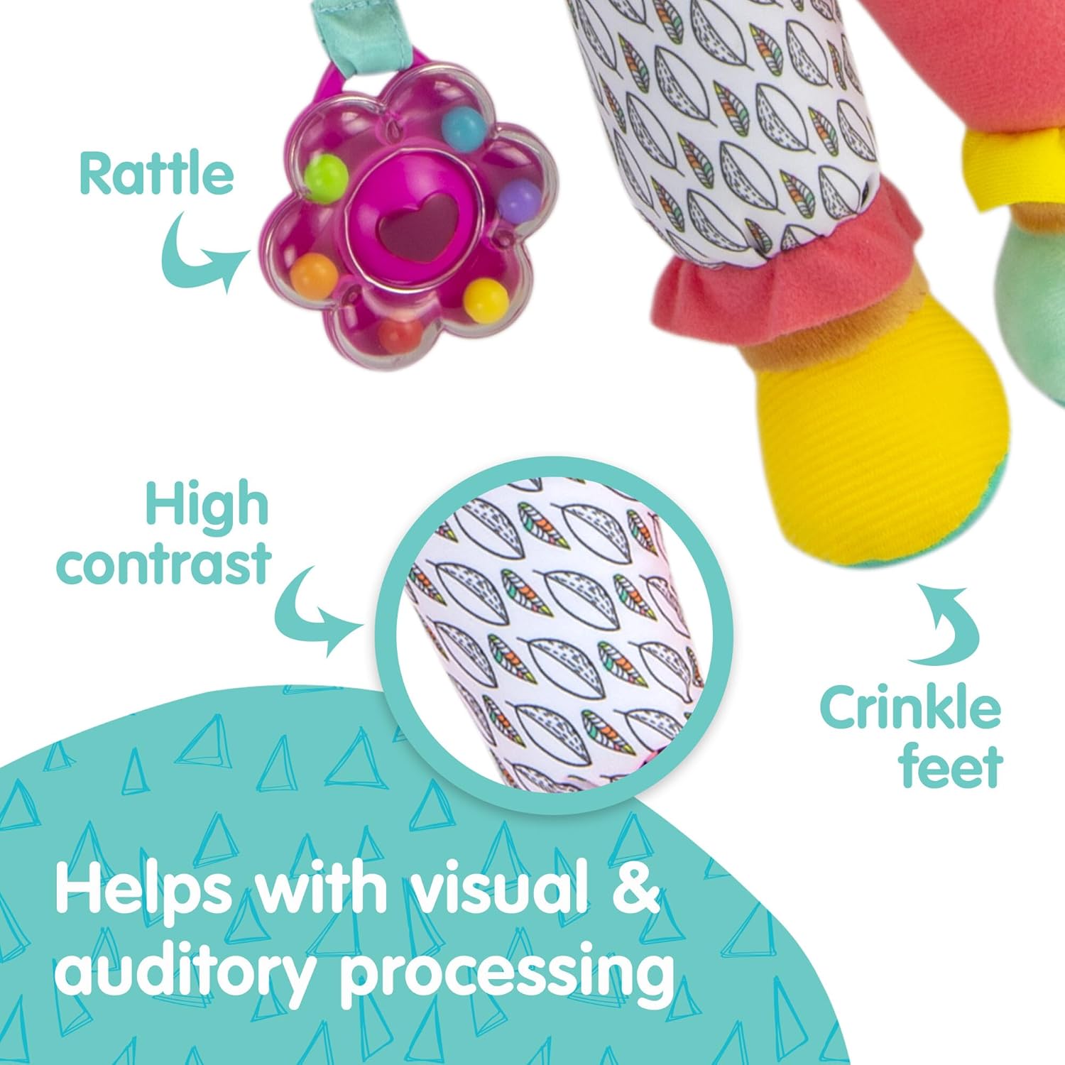 Lamaze’s My Friend Olivia is a perfect first doll for baby! She has a crinkly skirt, so many fabric textures to explore, an adorable embroidered face, and a rattle flower that's tethered to her hand to look like a cute purse. With all of these engaging features, Olivia helps you guide your baby through important first stages of development. Bright contrasting colors and patterns stimulate baby’s visual development while different textures to grip and grab help improve fine motor skills and tactile development. Olivia is also a wonderful toy for bonding time with baby where you can begin early role play and social skill development as your baby grows. Olivia loves to travel too! She includes a large clip that makes her easy to attach to a stroller, car seat, diaper bag, and more. Sensory learning is sure to bloom into a lovely new friendship with Lamaze’s My Friend Olivia.