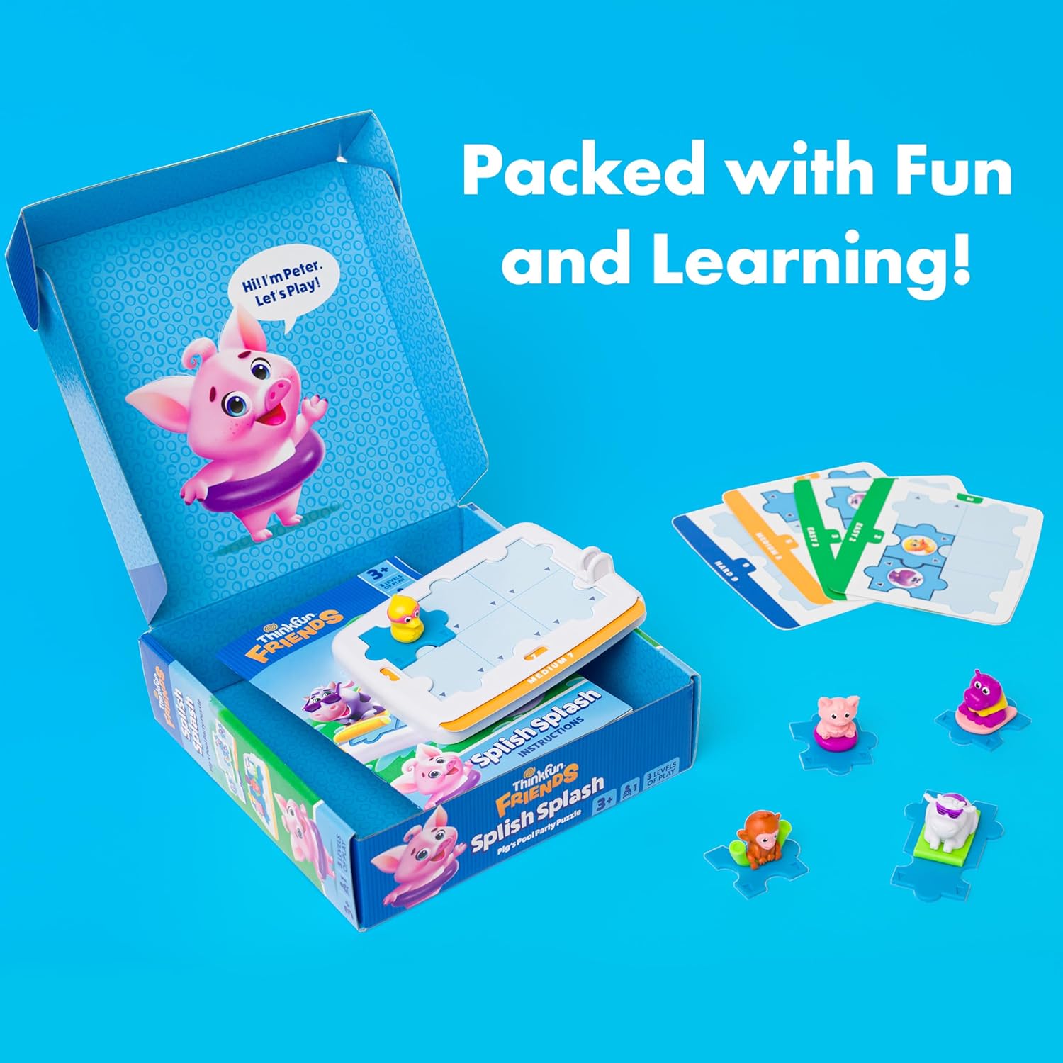 ThinkFun Friends: Splish Splash is an engaging single-player preschool game filled with fun and learning! Featuring three levels of play and 10 exciting challenges, kids will dive into problem-solving, spatial reasoning, and fine motor skills in this interactive game!