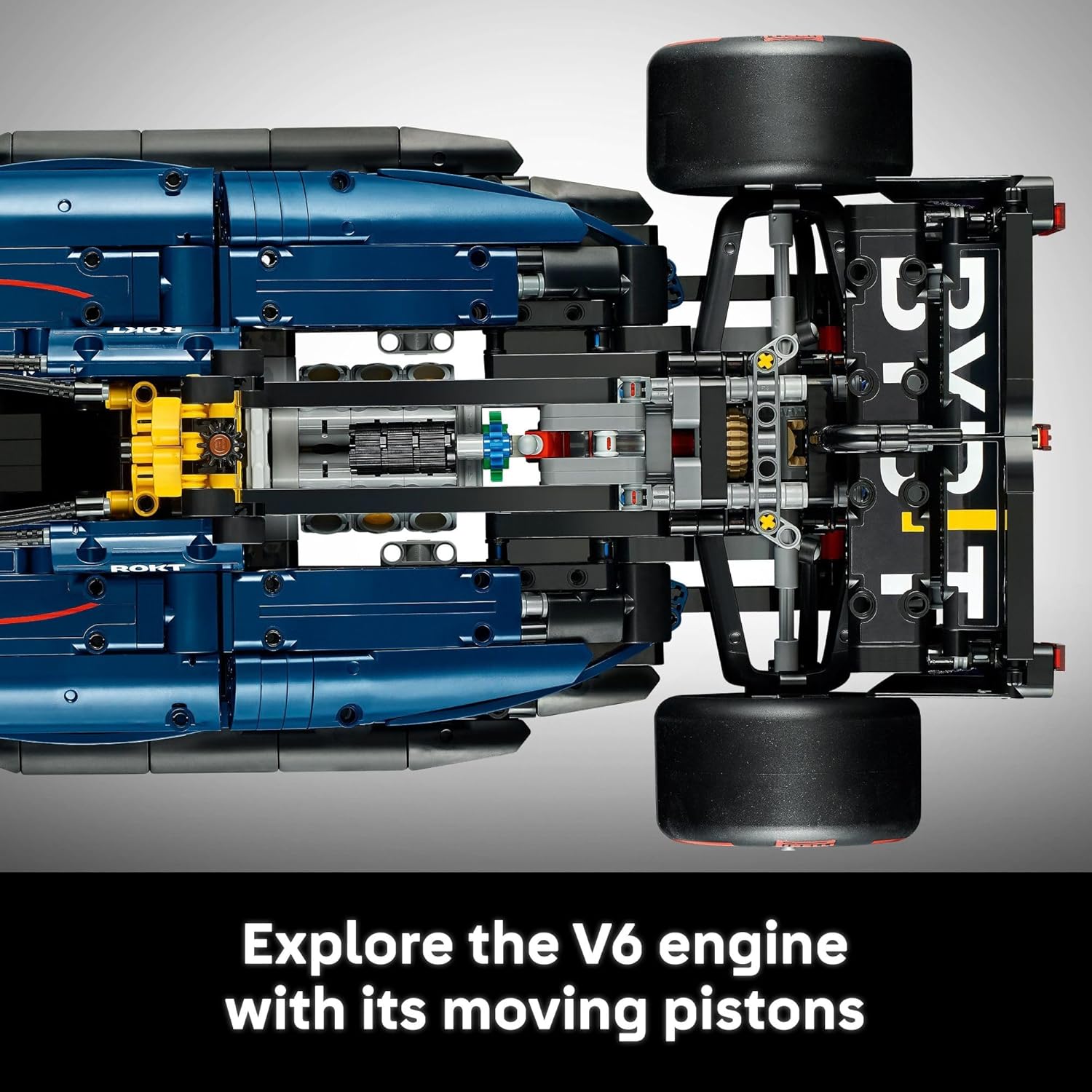 Steer the car into position using the knob on the roof or the steering wheel in the cockpit before testing the suspension at the front and rear of the car. Examine the 2-speed gearbox and differential and remove the engine cover to see the V6 engine with its moving pistons. Then adjust the spoiler to mimic the DRS before displaying your car in tribute to your passion for F1.