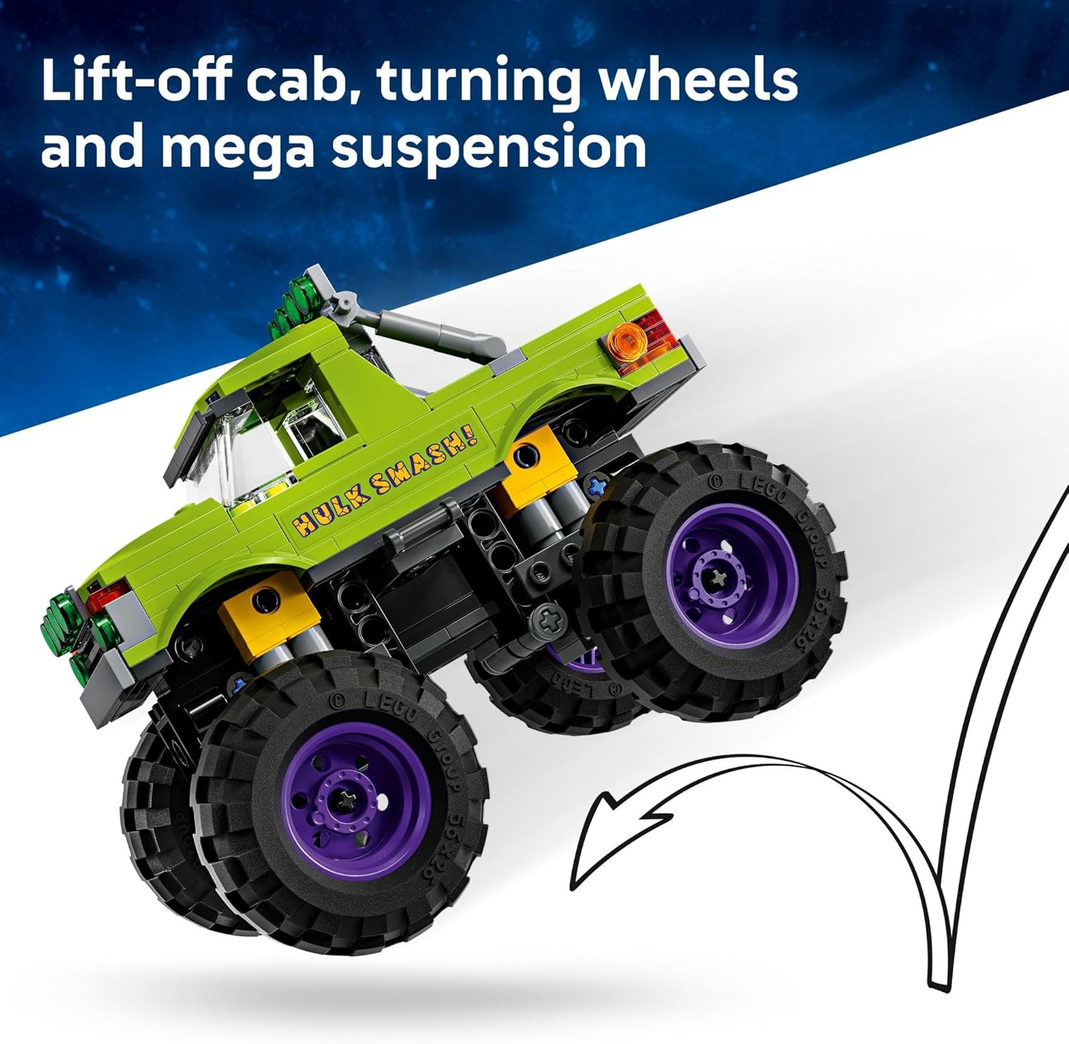 This buildable LEGO ǀ Marvel heavy-duty truck features a Hulk minifigure with a removable helmet and a Thanos minifigure with a Tesseract and Infinity Gauntlet. The Super Hero truck features a lift-off cab, providing access to the driver’s seat, with room for the Hulk minifigure. The outside is green with ‘Hulk Smash!’ and Hulk’s face decorations. With large turning wheels, a robust design and shock-absorbing suspension, the mega truck can handle the toughest of missions. For added digital fun, builders can zoom in, rotate models in 3D and track their progress using the fun, intuitive LEGO Builder app. Set contains 229 pieces.