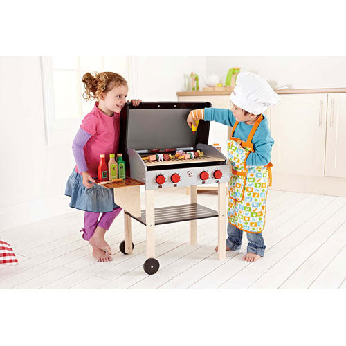 Keep an eye on those burgers! Is that fish done yet? This Gourmet Grill will have your youngster cooking with gas in no time! Little ones will love grilling up an imaginary BBQ feast for friends. A hood that opens and closes, adjustable dials, a collapsible side table, a double-sided grill rack... It seems so close to the real thing! With a little practice, maybe they can even teach Mom or Dad a thing or two about grilling that perfect, juicy burger. This set comes packaged with the Shish Kabob Set so your little chef can get to grilling in no time!