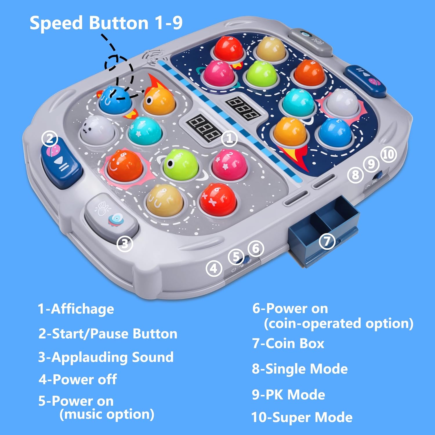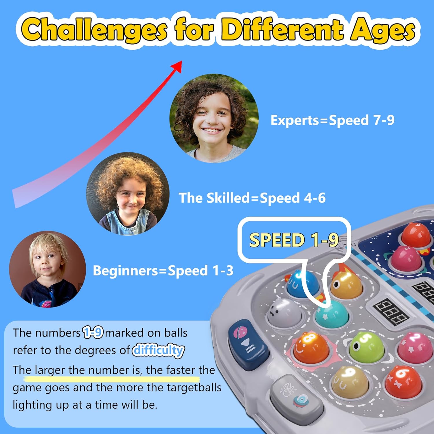 With 15 levels and five speeds, kids will have fun while their skills improve. Featuring eye-catching colors, dynamic sound effects and dazzling flashing lights, this Whack Attack Space Moles game will transport your child straight to the arcade. Set it to two-player mode and kids can challenge their friends or family members to epic mole-whacking battles, adding an extra level of excitement and friendly competition to the game.