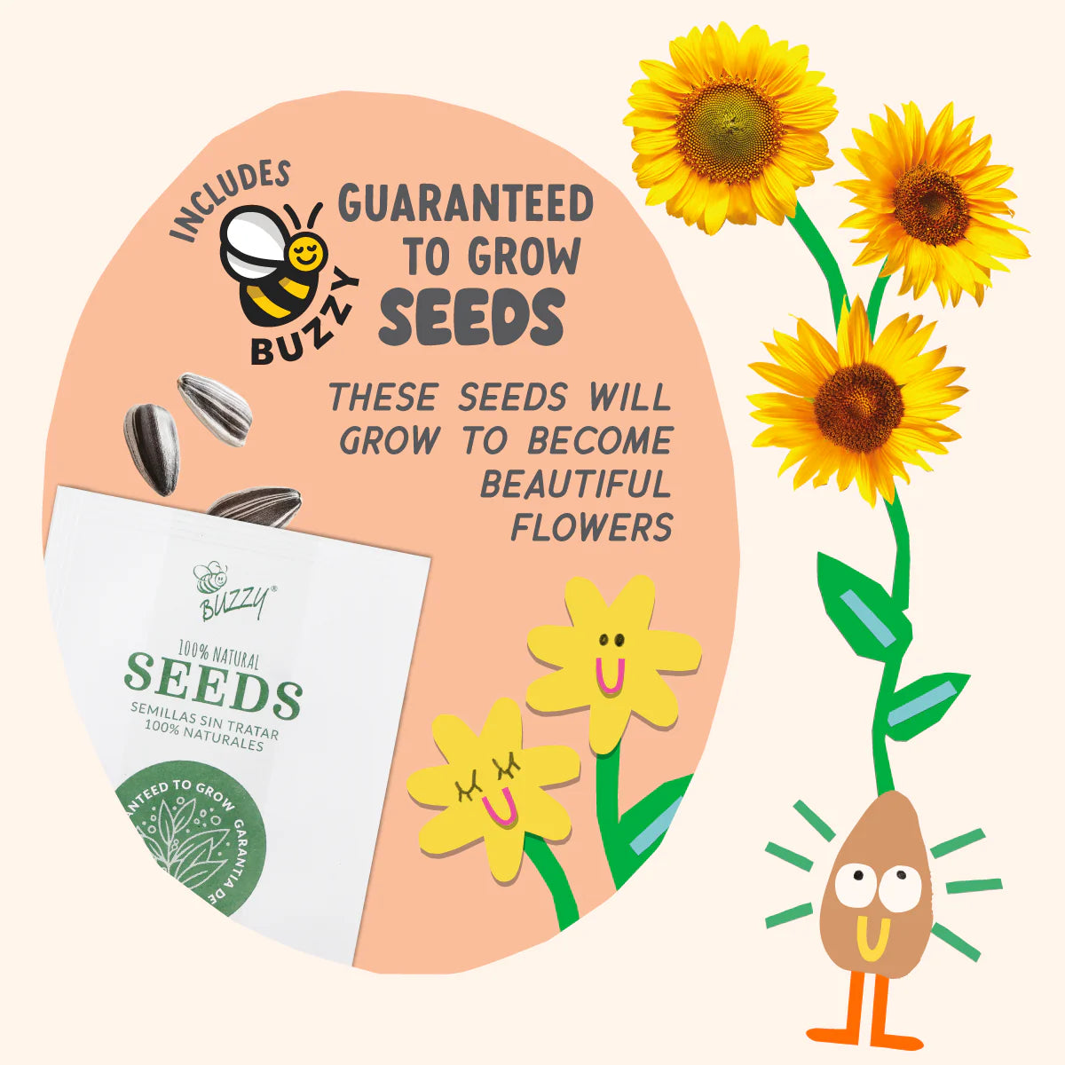Add the growing medium into the vase, pour in water and watch the soil expand like magic! Plant your real Mini Sunflower seeds! These seeds from our friends at Buzzy are guaranteed to grow. With sunlight and diligent watering, you will see sunflowers start to grow in 7 to 14 days.