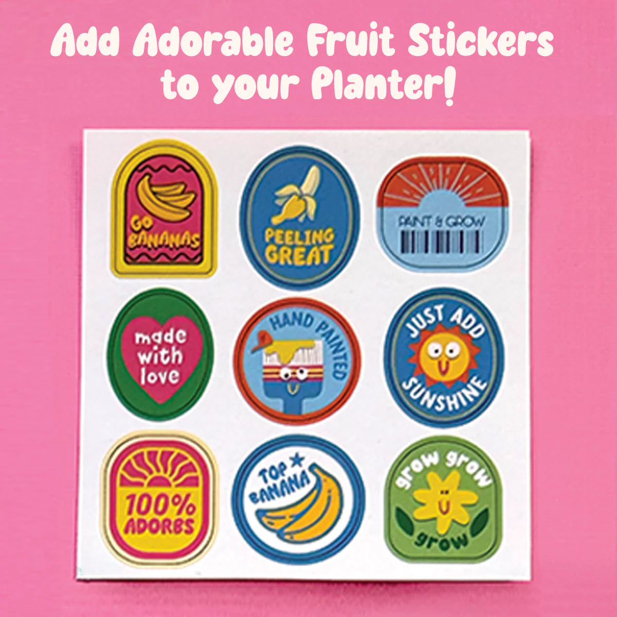 Includes ceramic banana character vase (4” x “5” x 3”), growing medium pellet, pack of Mini Sunflower seeds, 6 ceramic paints, paint brush, Bright Stripes Craft Club bonus sheet of fruit stickers and growing instructions.