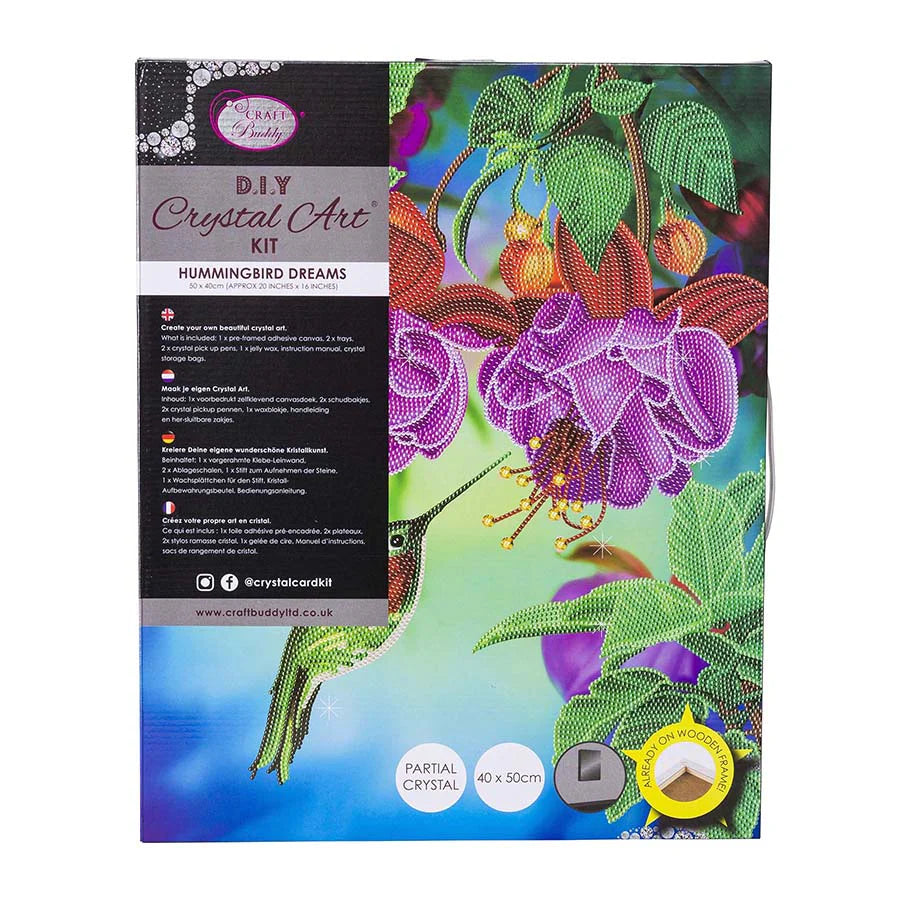 Whether the bird is swan diving into the flowers or approaching it from the west, this image can be enjoyed from any angle - portrait or landscape. The vibrant pinks and greens pop beautifully against the blue background making this a bright and cheerful image to enjoy. It's one of the top selling images of the Crystal Art Large Framed Mounted Kit.
